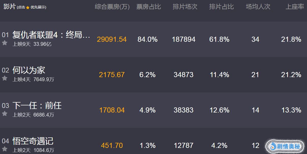 《复仇者联盟4》票房份额这几日略微有下降,这主要是这段时间新开画了几部新片分流些许场次,目前它还是绝对主导称霸市场。今天又进账了2.9亿以上(截止18点20),上映9天票房收33.96亿元,马上就冲破34亿了,漫威大片吸金力果然很厉害。放眼好莱坞进口片在国内票房能打败它的只有卡梅隆了,明年就看《阿凡达2》票房表现了。