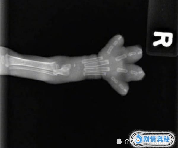再来看第二个猫爪,之前有网友把猫爪照了X光,看到X光下猫爪也非常可爱。如果不是四个指头的话,一定有很多人以为这是婴儿的胳膊呢。其实X光下的猫爪和真实的猫爪还是比较相似的的,不知道猫咪看到自己X光下的爪子后会有什么举动呢?