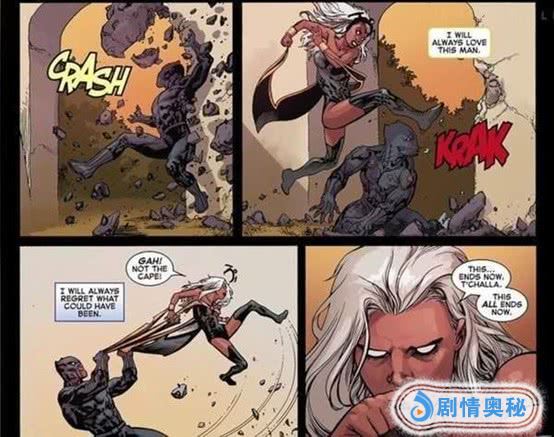 暴风女嫁给黑豹以后成为瓦坎达人民爱戴的王后, 然而在复仇者vsX战警的交叉事件中,两人站在了对立面。