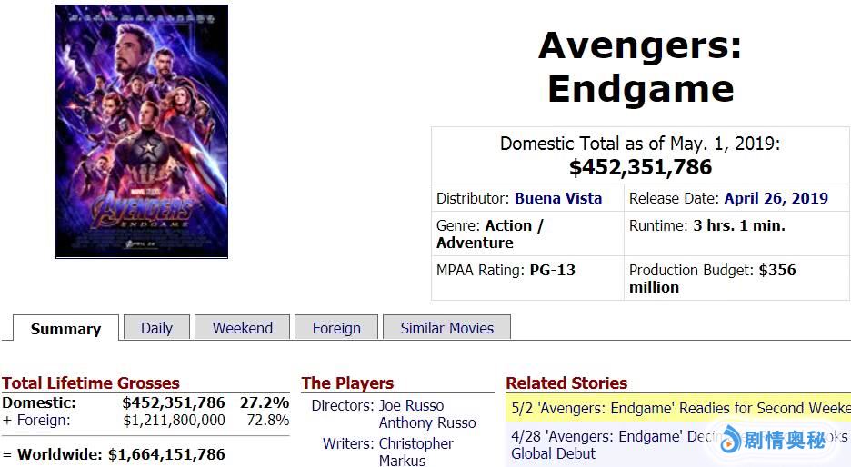北美6天狂轰30亿,内地10天票房37亿以上,仔细一对比发现美国人比内地观众更疯狂。《复仇者联盟4》本土票房大爆是理所当然的,但是内地追捧好莱坞大片也是事实,漫威这部大片不单是美国人的狂欢,更是世界影迷的狂欢。本周结束后全球累计冲破20亿美元无悬念了,届时它将成为史上第五部20亿美元俱乐部影片。