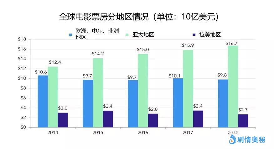 而北美之外的国际市场票房下降了2%。其中亚太地区的票房较2017年增长了5%,达到了167亿美元,主要的增长动力来自中国12%的年度增长。