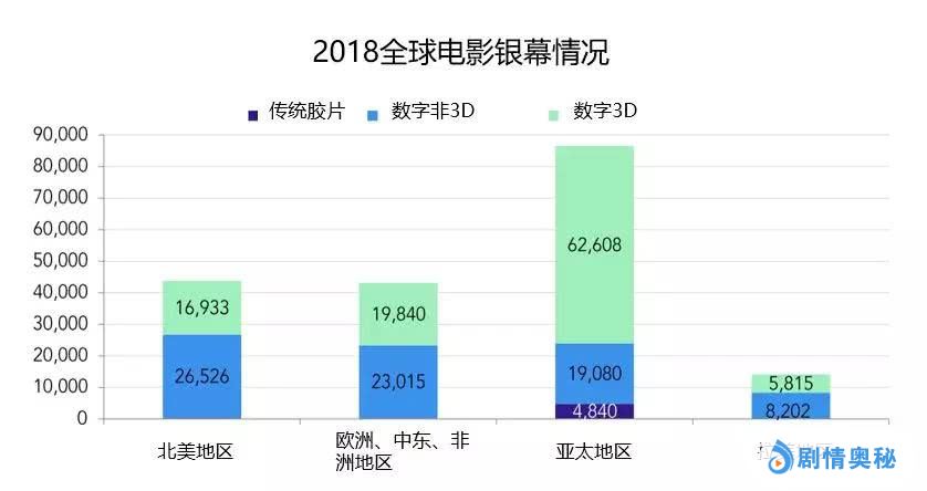 全球电影银幕数量去年增长了7%,达到了19万块,主要是来自亚太地区13%的增长助推。截止2018年底,全球已有97%银幕实现数字化,剩下的3%采用传统胶片放映的电影主要集中在亚太地区。