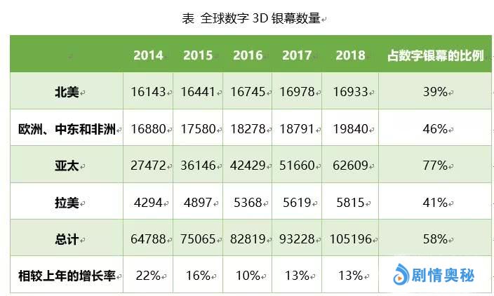 全球的3D银幕数量增长了13%,达到了10.5万块。2018年,除北美地区外,世界其他地区的3D银幕数都出现了增长,其中亚太地区的3D银幕占有率最高,在其数字化银幕中,有77%可以实现3D放映。