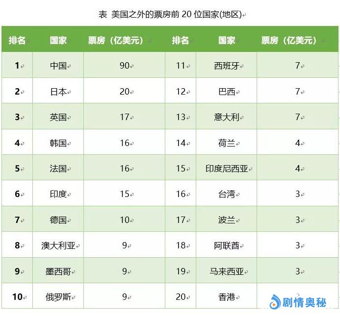 从国别来看,2018年除美国外,票房最高的国家为中国(90亿美元),日本(20亿美元)和英国(17亿美元)。马来西亚和阿联酋首次进入了前20大市场,取代了阿根廷和土耳其。