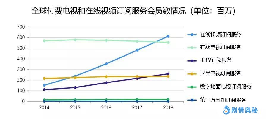 2018年全球在线视频服务(例如奈飞和亚马逊等视频网站)的订阅用户数量达到了6.13亿,较2017年增长了1.31亿,增长率27%,总量也首次超过了有线电视订阅用户数量(5.56亿),后者在2017年下降了2%。