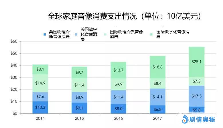 2018年全球家庭音像市场的消费总额为558亿美元,增长了16%,其中美国的市场增长了12%。数字化家庭音像的增长是主要的驱动力,美国的数字化音像消费增长了24%,而国际市场的数字化音像消费更增长了34%。从2014年以来,全球数字化的家庭音像消费增长了170%,而以DVD、蓝光碟等为介质的家庭音像消费则下降了48%。