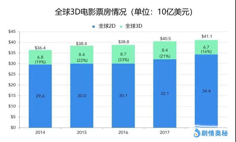 2018年,全球的3D电影票房达到67亿美元,占全球票房的16%,较2017年下滑了20%。在各个地区都出现了3D电影票房下滑的趋势。其中亚太地区的下滑相对较少(14%),而北美地区的下滑最多(34%),以广泛发行的方式(即超过600块银幕以上同时放映)在北美发行的3D电影数量较2017年下降了21%。