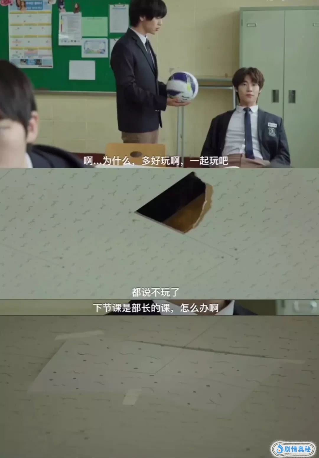 还有一次,男主邀请男二在教室里踢球,结果将教室天花板踢坏。