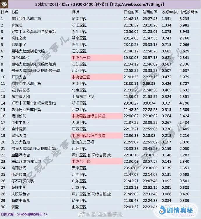 数据显示,《奔跑吧》4月26日首播当晚55城收视率为1.334%,低于《向往的生活》1.351%。