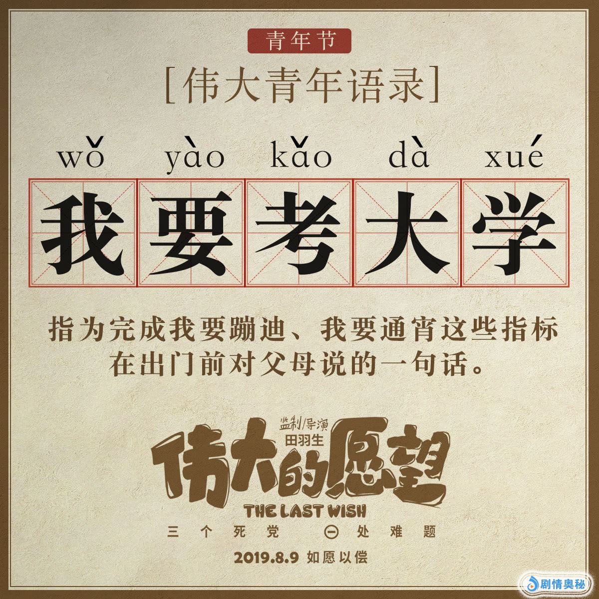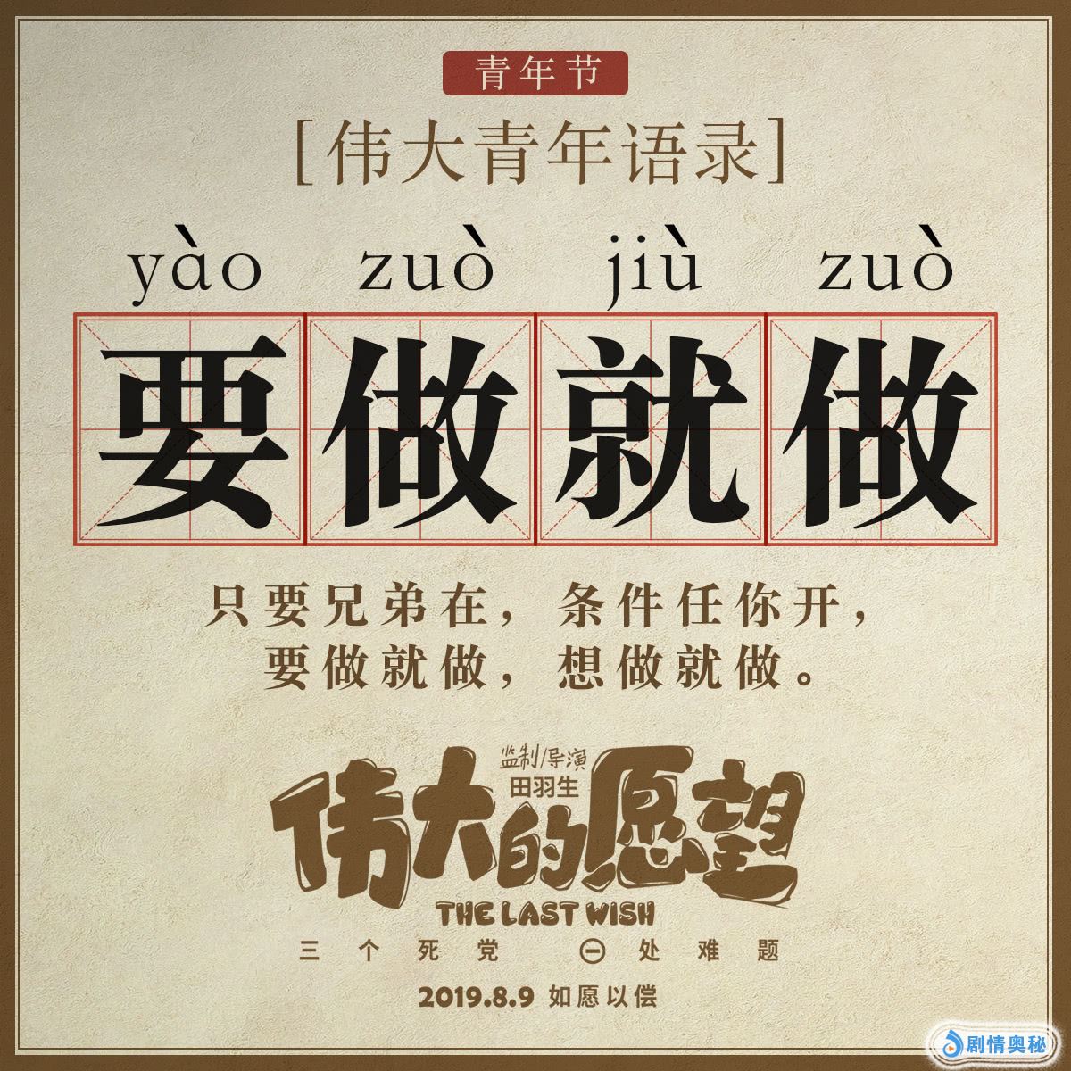 由《前任》系列导演田羽生执导的喜剧电影《伟大的愿望》自宣布定档8月9日以来,热议不断。此前发布的定档预告中,彭昱畅许下“成人”愿望,王大陆、魏大勋一旁煽风点火,为了帮助兄弟实现“成人梦”一路突破底线,笑料不断。今日,影片为契合五四青年节,发布了一组“伟大青年语录”,让观众对剧情有了更多猜想和期待。
