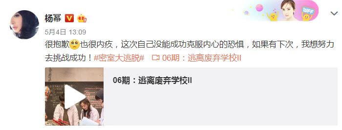 杨幂发文道:“很抱歉,也很内疚,这次没能成功克服内心的恐惧,如果有下次,我想努力去挑战成功”,其实《密室大逃脱》中的明星嘉宾和杨幂的关系都非常好,大家肯定也不会因为杨幂恐高就觉得她拖累了大家,反而在节目中大家都非常暖心的安慰大幂幂,毕竟恐高这件事是自己无法控制住的东西。
