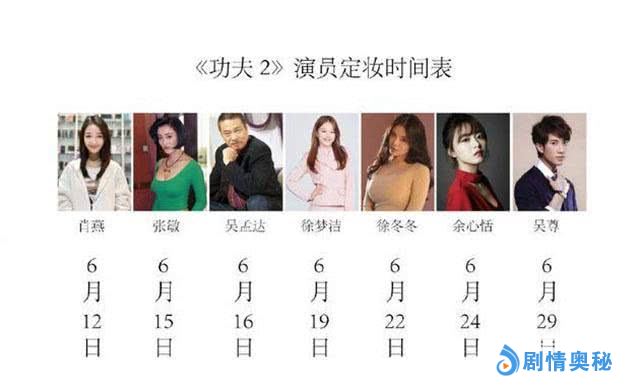 《功夫2》是周星驰宣传《新喜剧之王》时亲口承认要拍的电影,近日网上流传一份《功夫2》演员定妆表,曝光肖燕、张敏、吴孟达、徐梦洁、徐冬冬、余心恬、吴尊七大主演,定妆时间从6月12日一直到6月29日,对此周星驰的助理转发并回应4个字母“fake”,言简意赅。