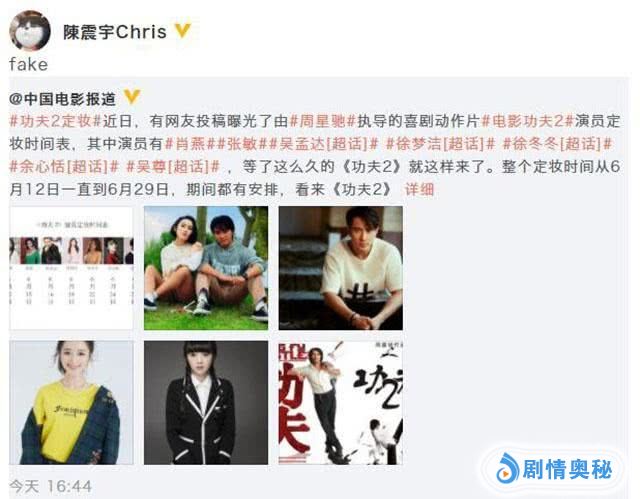 对这份名单,周星驰的助理在微博上用“fake”4个字母回应,这是飙脏话的意思,那肯定消息是假了,想想也是,周星驰拍电影,要么是路透被拍到,要么是杀青之后官宣,很难看他开拍之前就暴露什么动静。想借着周星驰名头涨涨名气的人不在少数,之后怕是还会有更多类似的名单流传吧。