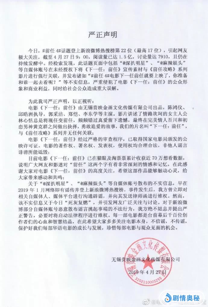 面对这种不实谣言,片方火速发表声明来澄清《下一任:前任》并非“前任4”,并向相关媒体发送律师函,用法律手段维护自身权益。