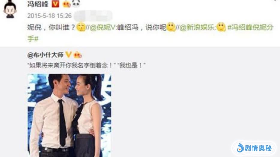 留下的这个微博就是 “如果将来离开你,我名字倒着念。”然后两个人发博,一个妮倪,一个峰绍冯。这个梗也是挺逗的。因为两个人的名字倒着念完全没变化,都是一样的。所以,也似乎冯绍峰留着这个文章代表他早已放下了。而且同时也是对过去告个别。一别两款,只望各自安好。