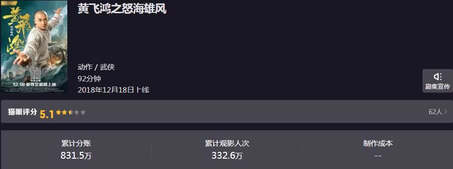 《黄飞鸿》系列是赵文卓的头号招牌,比如去年的《黄飞鸿之南北英雄》《黄飞鸿之怒海雄风》观众反响就很不错。赵文卓在影坛被吐槽最多就是“票房毒药”,但他这两部网络电影票房成绩真不错,分别收到1312万和831万,接下来他还有《纹身:西部纵横》《霍元甲》等大片。