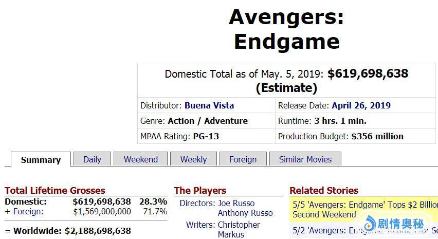 《复联4》上映2周全球票房破147.36亿(21.88亿美元),北美加内地轰出80.5亿(11.95亿美元)。很多人都看好明年卡梅隆《阿凡达2》王者归来,但要想开出这么炸裂的票房太难了,卡神终于遇到最强对手了。国内网友见惯了大数据,几十亿票房早已习以为常,但是一部电影收上百亿票房还是很少见的,这就是好莱坞超级大片的强势。