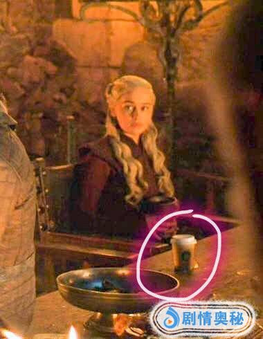 在第四集的一个场景中,龙妈和雪诺在庆祝着,其他所有人都在喝酒助兴,可是心细的网友却发现在龙妈眼前的桌子上却摆着一杯星巴克!所有别人庆祝喝酒,龙妈庆祝喝咖啡?当然不是啦!作为一部以全世界观众为受众的剧集,惊现咖啡这样的穿帮可还行?