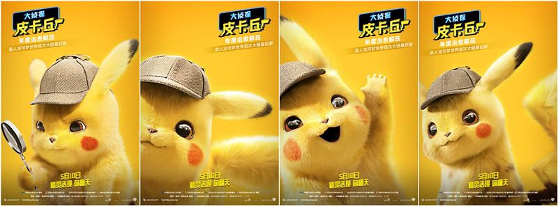 海报中,皮卡丘玩起来动感四连拍,或招手、或45度角侧颜杀、或拿放大镜端详,尽显“贱萌”本色。本片由瑞安·雷诺兹、雷佳音分别担任皮卡丘的英文和中文两版配音,引发粉丝“一刷小贱贱,二刷雷大头”的呼声。