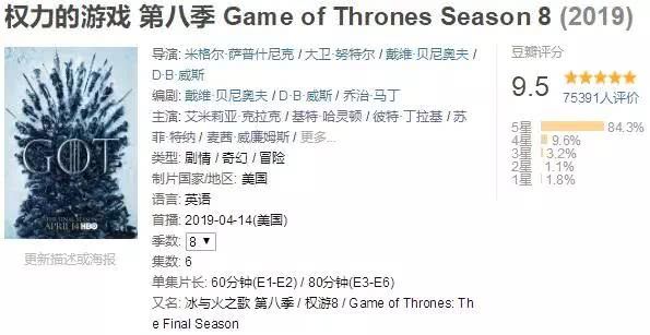 在豆瓣平台,《权力的游戏》第八季刚开播之时,一度冲上了9.8分,播了4集之后,稳拿9.5分,一星好评超84%。