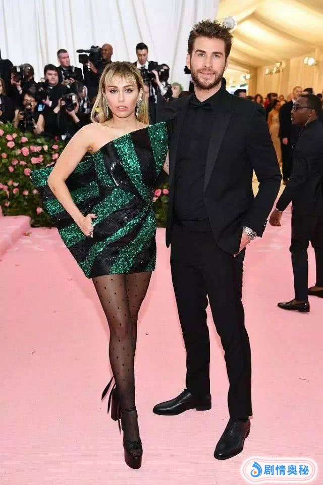锤弟一身笔挺的黑色西装,甚有男神范儿,而麦莉的紧身条纹短裙亦很出彩,设计感十足的裙身搭配亮片装饰,非常时尚。
