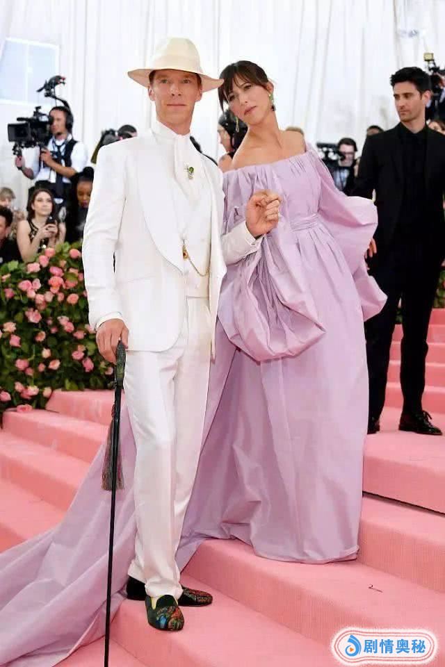 卷福身着白色西装套装,头戴同色礼帽,一派的英伦绅士风度,而妻子则以一袭紫粉色一字领长裙亮相,宽大的蓬蓬袖及拖尾设计,让整个人看起来非常甜美。