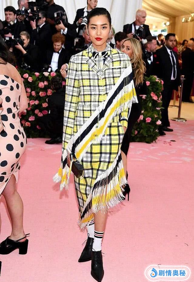 已是第十次亮相MetGala的大表姐刘雯,则以一袭Thom Browne的格纹流苏西装裙亮相,造型复古气质出众,一对烈焰红唇更是十分抢眼。