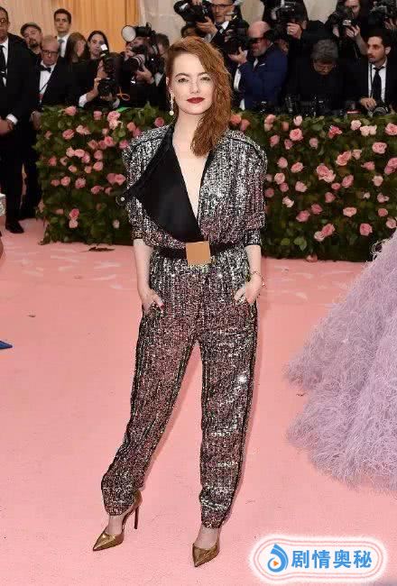 这边,“石头姐”艾玛·斯通则一身Blingbling的裤装亮相,神采飞扬。