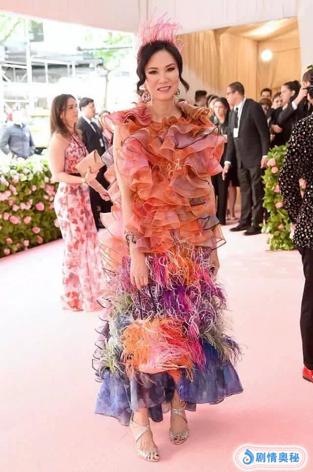 社交达人邓文迪则穿了一件彩色蛋糕裙出席,裙摆的羽毛设计恰好与羽毛头饰呼应,只是裙身如此繁复的褶皱设计,完全显露不出邓文迪苗条的身材,看上去好臃肿。