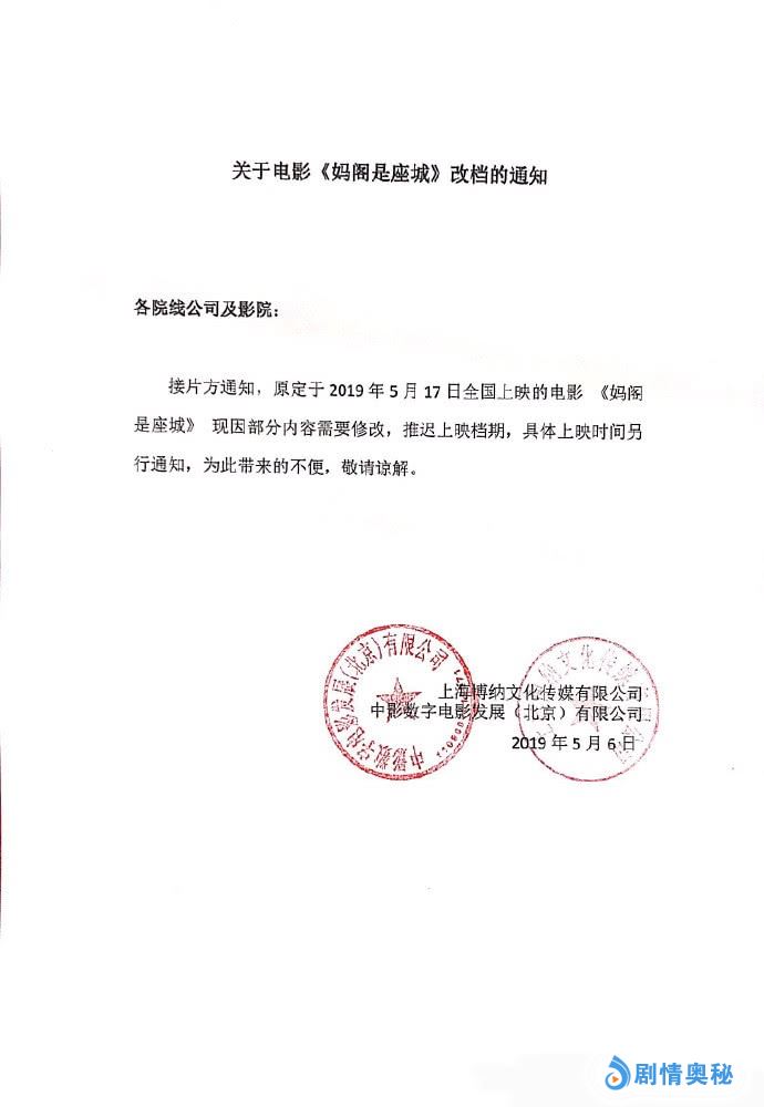 由李少红执导,白百何、吴刚、黄觉主演的影片《妈阁是座城》宣布推迟上映,影片原定于5月17日上映,撤档原因为“部分内容需要修改”。而何时会重新上线还没有准确的时间。
