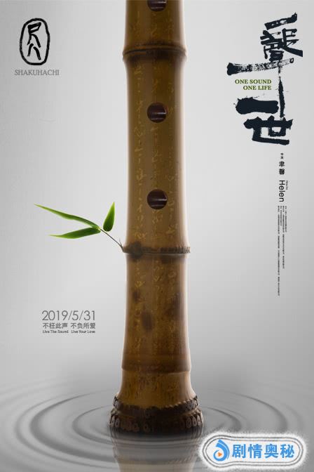 知名电影海报设计师黄海受导演聿馨之邀,观影后被影片中展现的热爱与坚持所打动,总结了两个词“温柔”与“生生不息”,当场表示了自己愿为本片创作海报的意愿。海报中,竹制尺八矗立于一汪水波之中,一身坦荡清澈如云,画风平静而淡泊,尽展空灵之感。设计师黄海将其钟意的尺八曲谱刻在竹制尺八上面,尺八根部漾起的水纹状如音波,向外扩散开来的同时寓意着传承,水墨色的恬淡基调,也与电影中尺八的“一声一世”温柔却长久的感情交相呼应。竹制尺八的枝节上衍生一段新竹,青翠欲滴,生命的旺盛与延续展现得淋漓尽致,又一次赋予千年前流行的尺八以新鲜的色彩。海报上的片名“尺八·一声一世”则是由导演聿馨亲笔所题。新旧文化的默契结合,虽只有寥寥几物,但已然带领观众直观感受到尺八的魅力和光影记录背后的深厚内涵。