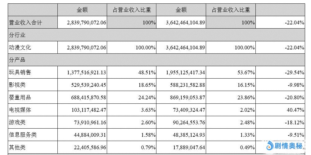 奥飞娱乐在玩具业务中,“陀螺”等项目销售不达预期,同时受到了海外玩具反斗城关闭的不利影响。在分产品营业收入构成中,可以看到奥飞娱乐的玩具销售一项同比下降了29.54%。