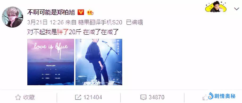 他在微博自曝胖了20斤,表示“在减了在减了。”