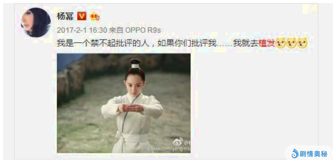 杨幂算得上是招黑体质了,不过她也是个不怕事的主。当网友都在笑话她的发际线的时候,她还发微博调侃说:“我是一个禁不起批评的人,如果你们批评我...我就去植发。”这种回应也逗笑了一片网友。