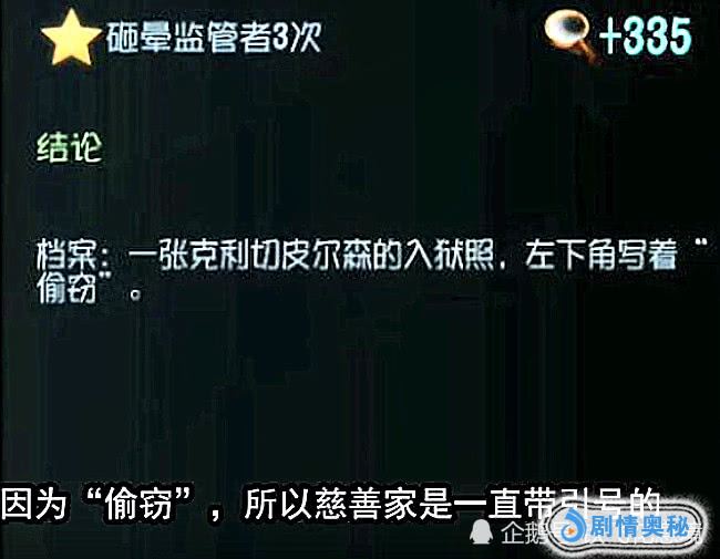 在后面的第九节的线索信息中,发现慈善家入狱了。在官方给出的线索档案中是这样写的“一张克利切皮尔森的入狱照,左下角写着偷窃”。所以慈善家入狱的原因是因为偷窃。继续后面的线索中,慈善家把孤儿院给了教会。并且孤儿院里大部分孩子都有精神病。