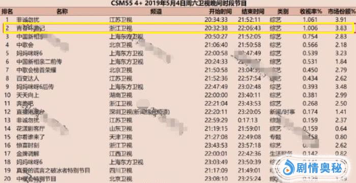 如今《青春环游记》第一期节目首播不久,收视率立马冲第二了,跟同一时间段播出的综艺节目来比还是领先了很多的,不得不说浙江卫视在综艺节目这方面做的真不错,除了《奔跑吧》这档爆款综艺外,如今又多了个《青春环游记》,相信随着节目的播出收视率会越来越高的。