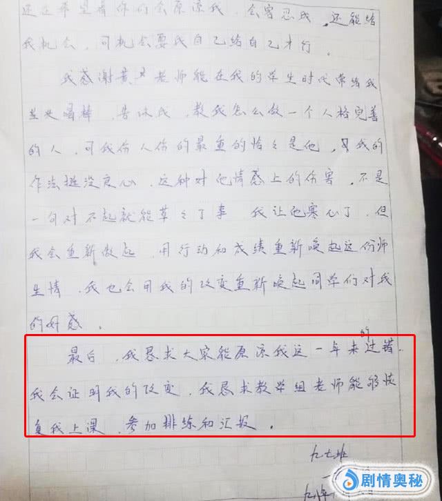 有网友在微博晒出黄海波大学时的检讨书,他和海清是同学,当时的老师是黄磊,黄海波因为请假顶撞黄磊才写了这份检讨书,文末有一句:我恳求大学能原谅我这一年来的过错,我会证明我的改变,我恳求教学组老师能够恢复我上课,参加排练和汇报。