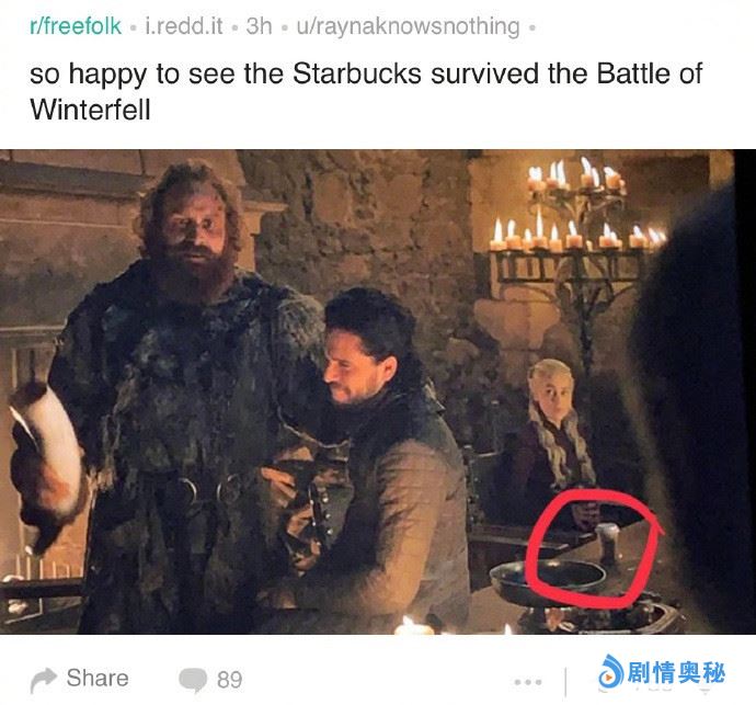 但事实上这个咖啡杯可能并不一定是星巴克的,而是剧组常备的咖啡,标志也模糊到无法辨认。《权力的游戏》官方账号也承认这是拍摄时的一个失误,而且还纠正说龙母点的是花草茶。