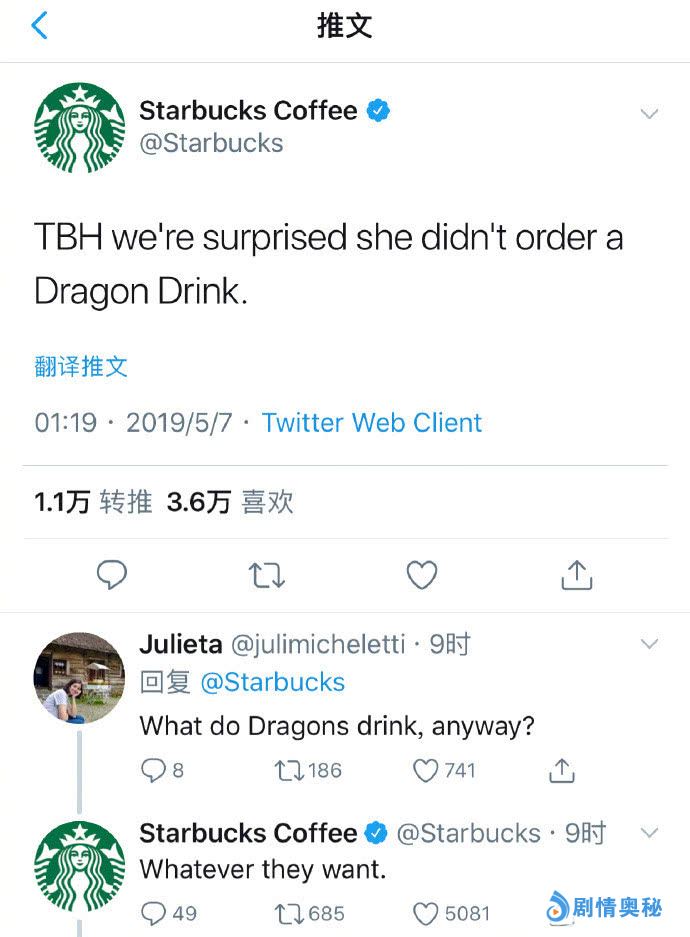 不过星巴克可没打算放过这么一个自我宣传的好机会,它在官方账号上说:“说实话我们很惊讶,她竟然没点我们的Dragon Drink(龙饮)。”而这个“龙饮”其实就是星巴克最新推出的一款产品。