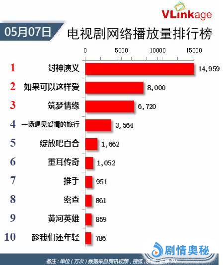 再来看看目前显示播放量的视频网站统计,电视剧网络播放量排行榜《封神演义》还是第一名,5月6日该天的播放量达到了1.4亿,差不多是第二名的两倍。