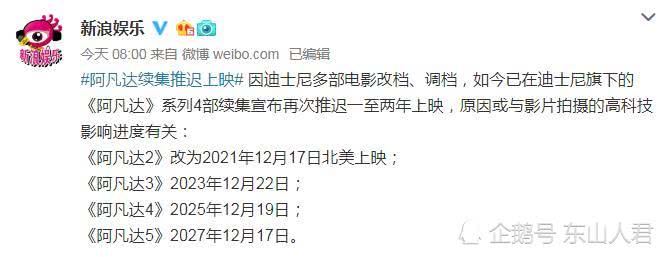 《阿凡达2》改为2021年12月17日;《阿凡达3》2023年12月22日;《阿凡达4》2025年12月19日;《阿凡达5》2027年12月17日。