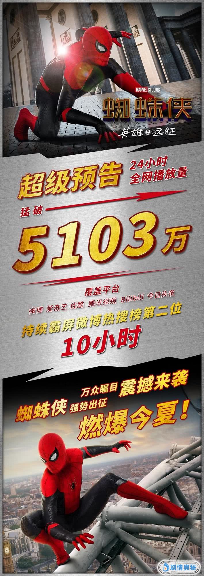 由美国哥伦比亚影片公司出品的电影《蜘蛛侠:英雄远征》(暂译)昨天发布超级预告,引发全网热议,24小时播放量破5100万,打破《速度与激情:特别行动》预告播放量2402万的纪录。首日全球播放量达1.352亿次,超越首支预告保持的1.3亿次的冠军纪录。本片由导演乔·沃茨执导,汤姆·赫兰德、杰克·吉伦哈尔、塞缪尔·杰克逊等好莱坞知名演员主演。影片延续《复联4》故事线,经过重重磨砺的蜘蛛侠在缅怀钢铁侠的同时,还将前往欧洲展开全新征程、开辟全新战场、对抗全新敌人,影片定于7月2日在北美上映。