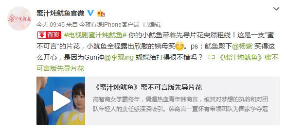 5月9日,由杨紫、李现等人主演的电视剧《蜜汁炖鱿鱼》发布了先导片。“ 你的小鱿鱼带着先导片花突然粗线!这是一支”蜜不可言“的片花,小鱿鱼全程露出欣慰的姨母笑!”