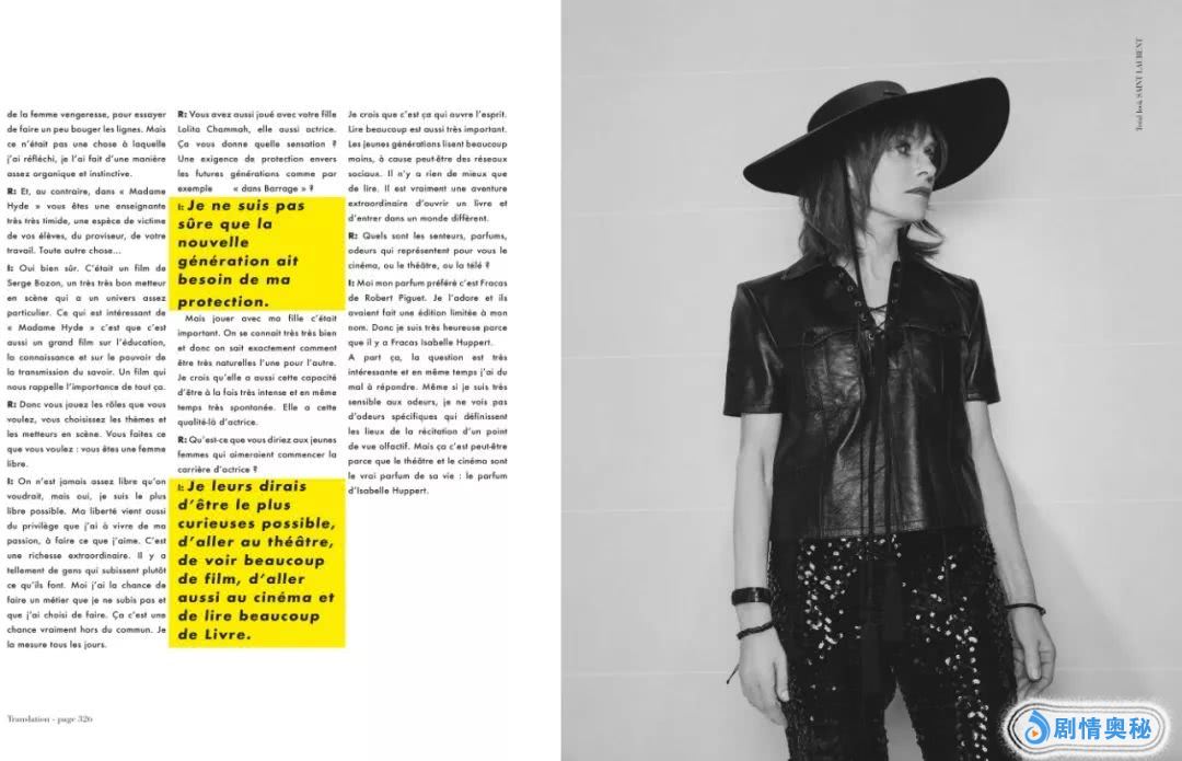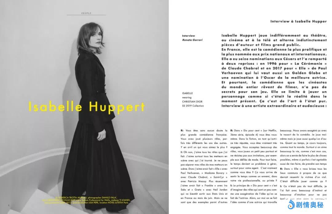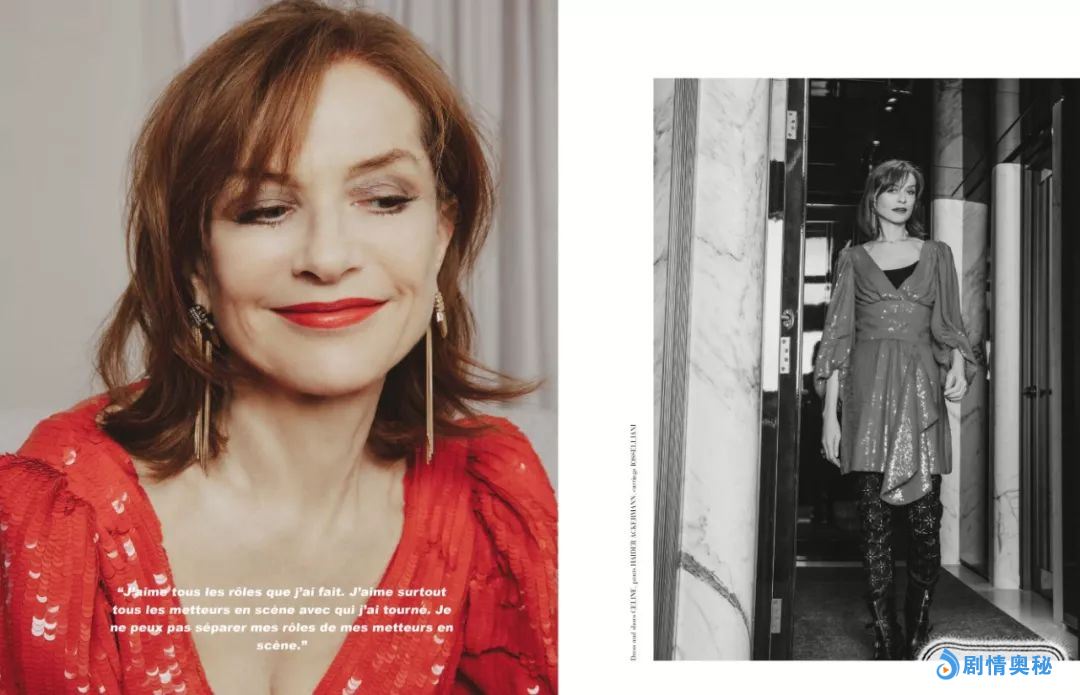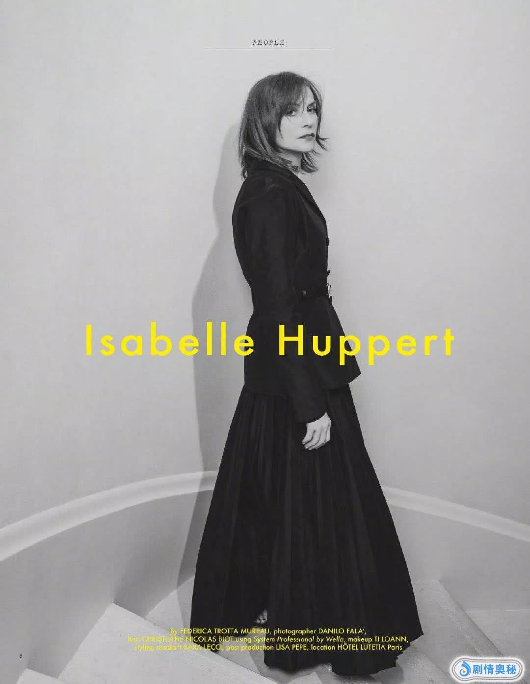 伊莎贝尔·于佩尔为杂志Mia Le Journal拍摄 一组写真。服装主要来自Saint Laurent(比如第一张图左边的黑色造型)、 Christian Dior Resort(比如第一张图右边的裙装造型)以及Celine。