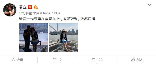 5月9号下午,袁立懒理网上负面评价,再次秀恩爱了,这次没去地铁亲吻了,而是去了轮渡船上秀恩爱。袁立发文说:谁说一定要坐在宝马车上,轮渡2元,依然浪漫。