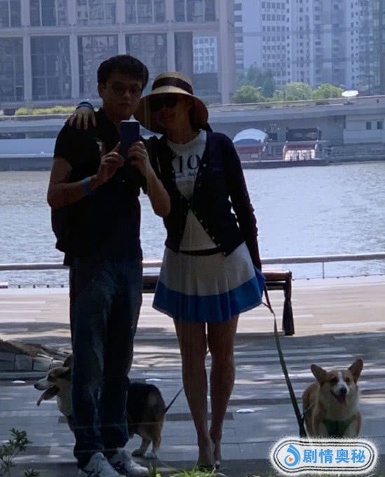 袁立戴上了一顶圆帽子和墨镜,身穿一条超短裙,露出笔直美腿,一边牵着宠物狗,一边搂住老公肩膀自拍。袁立脑袋微微向老公倾斜,满脸笑容,相当幸福。