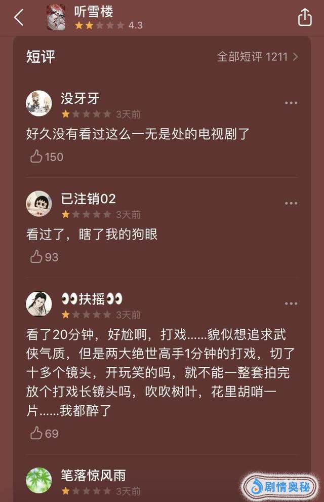 近日开播的《听雪楼》,因为太难看而被观众骂出热度来。
