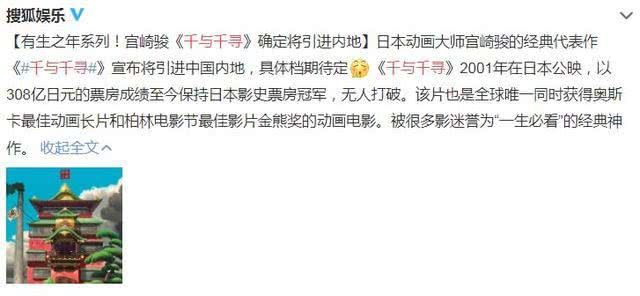 近日,由宫崎骏执导、编剧的动画电影《千与千寻》确定引进中国内地,目前档期未定,但应该在2019年上映。作为无数观众最喜爱的动画经典,《千与千寻》即将登陆内地电影院,确实令人十分期待!