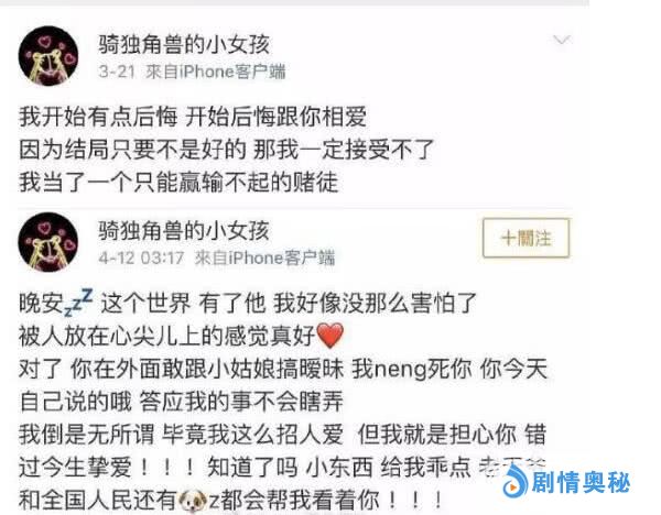 但到了3月份应该感情又回温了,小号里在说开始有点后悔,我当了一个只能赢输不起的赌徒。4月份的时候在网上给自己鼓气,还称小东西,给我乖点,老天爷和全国人民还有狗仔都会帮我看着你。这一看就是明星恋爱,普通人可没有全国关注和狗仔跟拍。