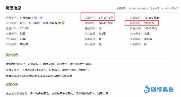 该高档别墅区户型是8室3厅8卫,两层商品房,建造于2010年,建筑面积1824平米,参考首付是10500万,也就是1.05亿,月供160万。车库可以停放200辆私家车,花园可以停飞机。